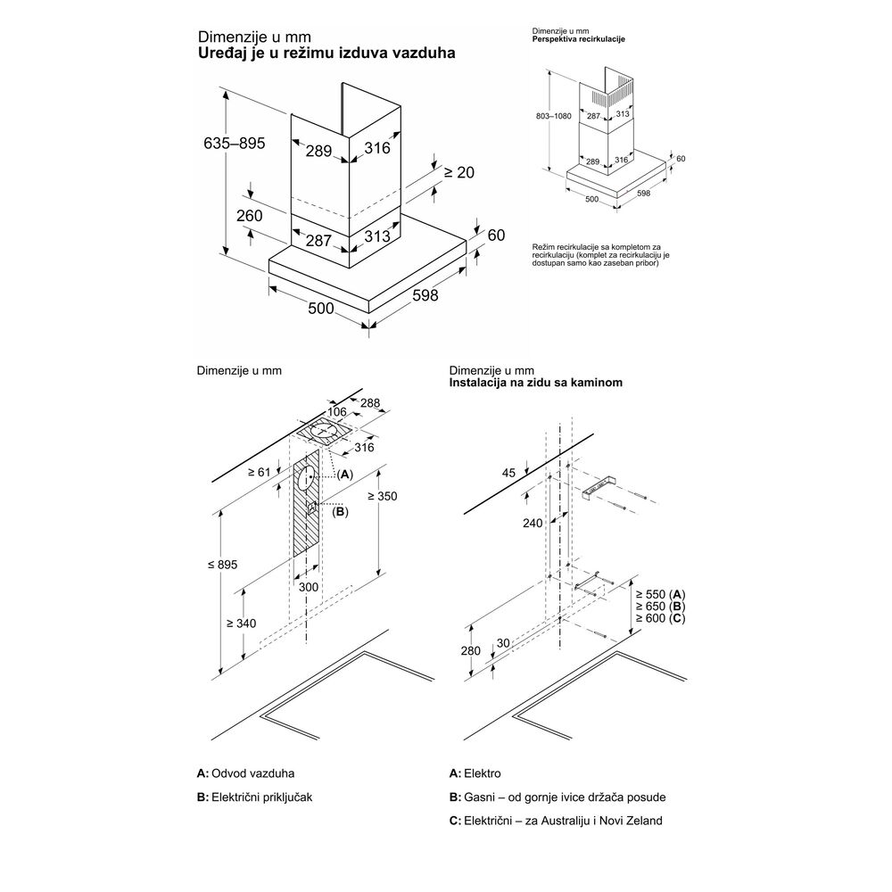 • Dimenzije - odvođenje vazduha (VxŠxG): 635-895 x 598 x 500 mm