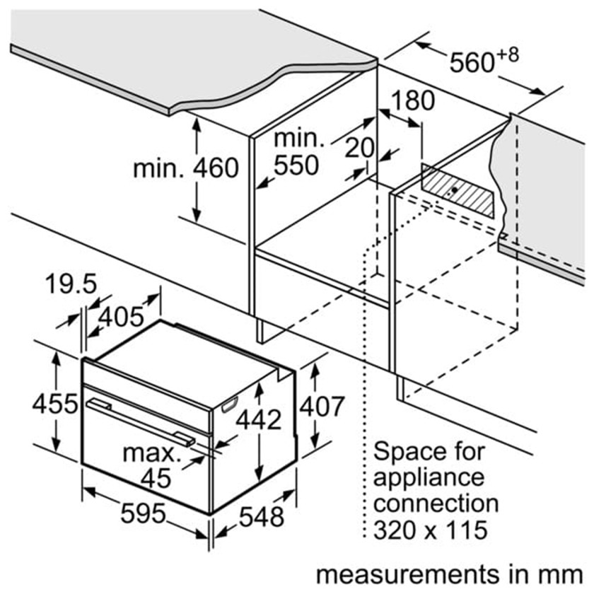 - Dimenzije niše (VxŠxD): 560 mm - 568 mm x 450 mm - 455 mm x 550 mm