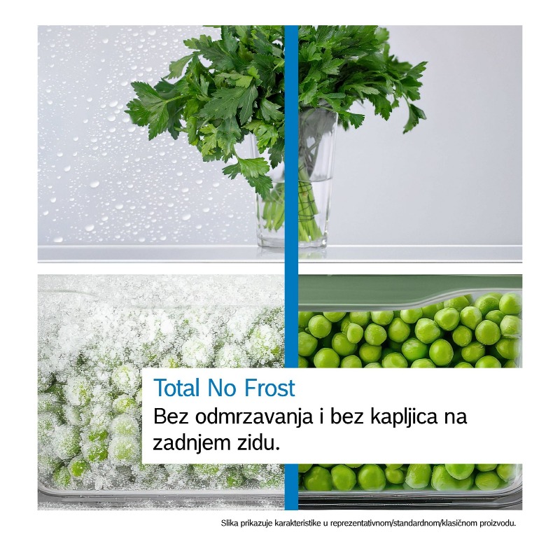• Total No Frost: Više nikada nećete morati da odmrzavate zamrzivač, a zadnji zid frižidera ostaje suv – bez kapljica
