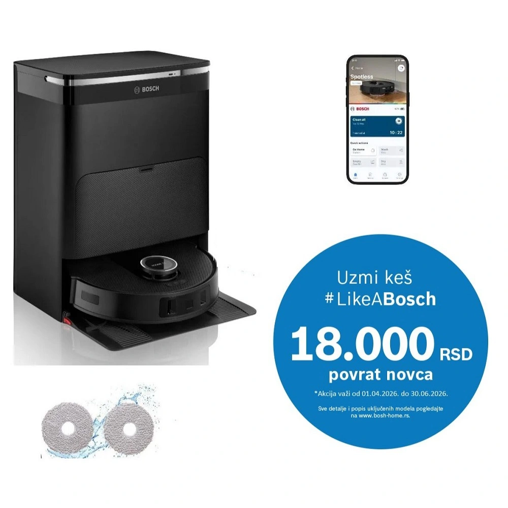 - Bosch Home Connect aplikacija: lako se povezuje sa robotom, nudi intuitivne kontrole, jasne obaveštenja i korisničku podršku