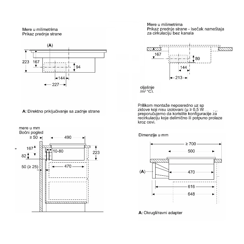 • Recirkulacija bez cevi zahteva vertikalni otvor ≥25 mm (poželjno 50 mm)