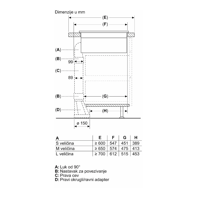 • Odvod vazduha putem cevi: min. 154, maks. 500 m³/h (normalan rad), 622 m³/h (intenzivni rad)