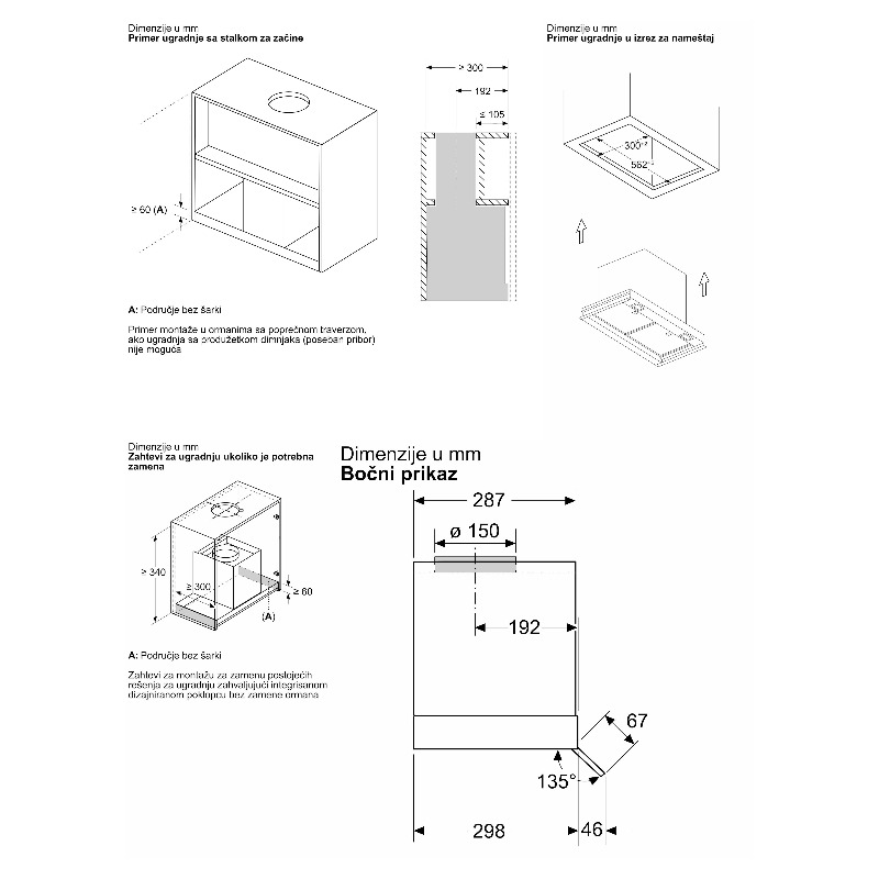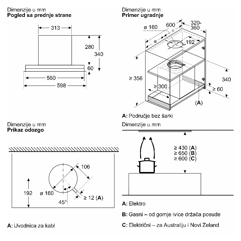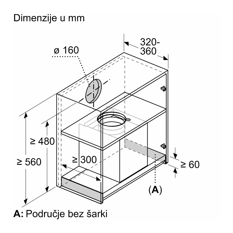 • Dimenzije za ugradnju (VxŠxD): min. 340 mm x 560 mm x min. 300 mm