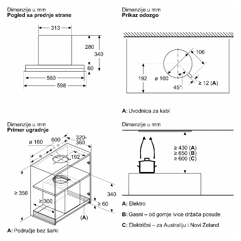 • Dimenzije za ugradnju (VxŠxD): min. 340 mm x 560 mm x min. 300 mm