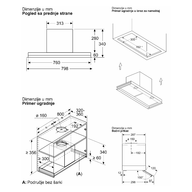 • Ugradnja u zidni ormar: Za ugradnju u zidni ormar širine 80 cm