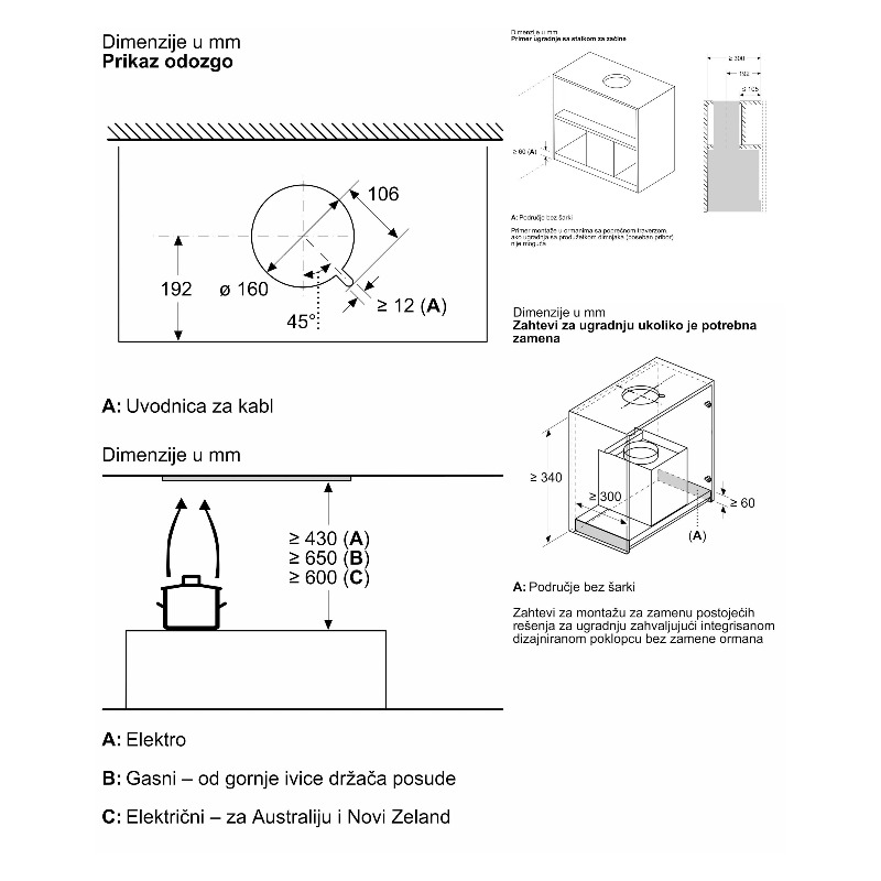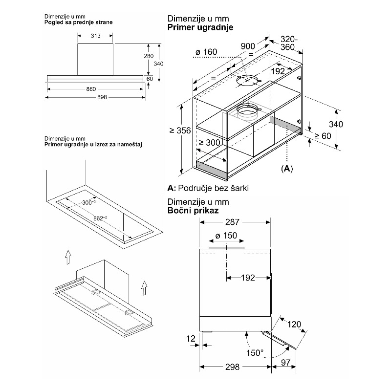 • Dimenzije za ugradnju (VxŠxD): min. 340 mm x 860 mm x min. 300 mm
